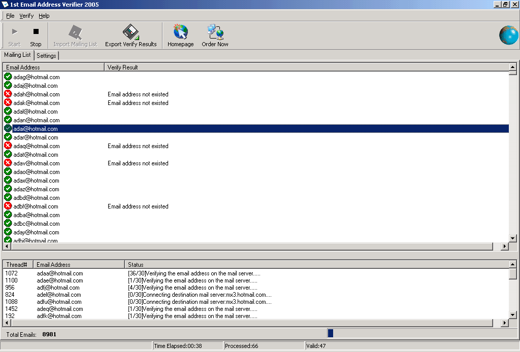1st Email Address Verifier (EAV) is a program that verifies the validity of e-mail addresses in mailing lists.The program works on the same algorithm as ISP mail systems do. Mail servers addresses for specified address are extracted from DNS. The program tries to connect with found SMTP-servers and simulates sending a message, but does not send the message out. EAV disconnects as soon as mail server informs whether this address exist or not. EAV can find about 90% of dead addresses - some mail systems receive all messages and only then see their addresses and if the address is dead send the message back with remark about it. 1st Email Address Verifier can save time and money for businesses who send newsletters to their clients, nonprofits who send bulletins to their members, or any person or business that needs to maintain a clean e-mail contact list.